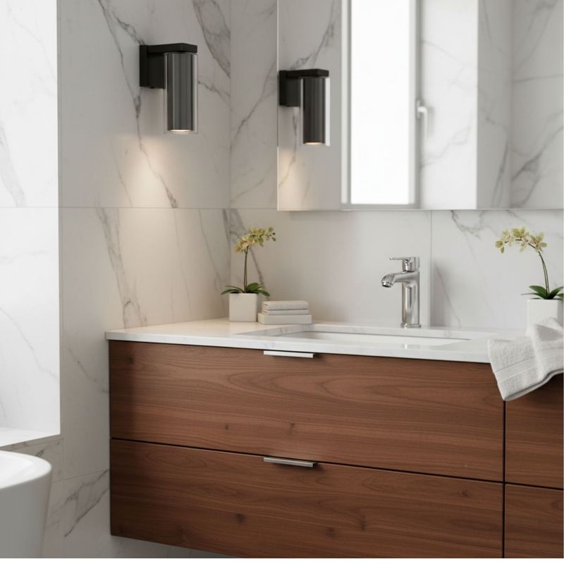 O design da Arandela Hilton AR1719PT apresenta linhas retas e acabamento preto, conferindo visual contemporâneo e sofisticado. Seu formato cilíndrico e difusor em vidro permitem distribuição uniforme da luz, tornando-a versátil para diversos estilos de decoração.