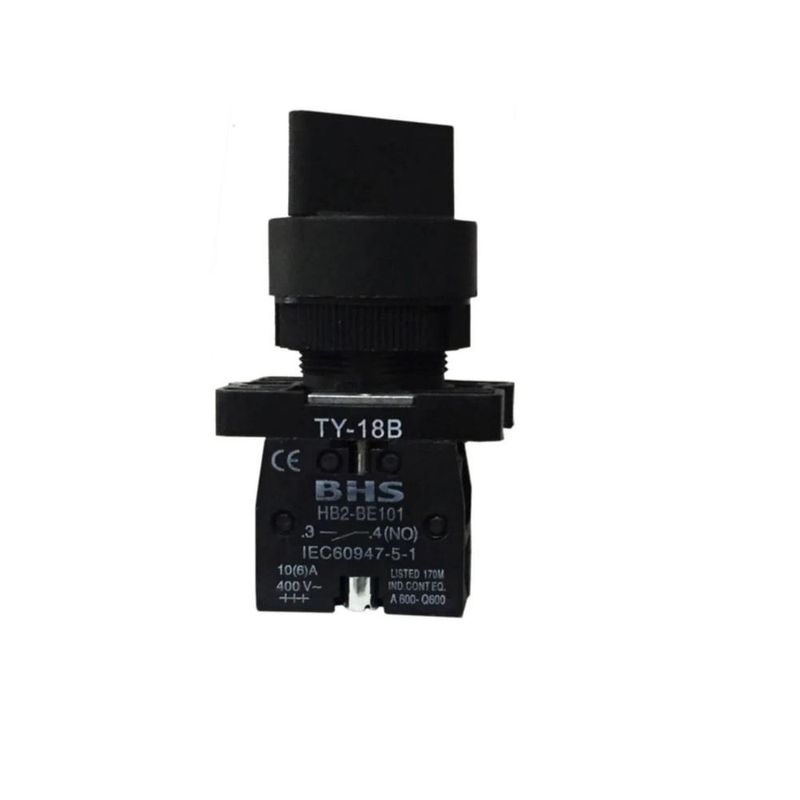 Botão comutadora com manipula curta 2 posições com retorno lado esquerdo, para furação de diâmetro 22mm, linha plástica, acompanhado com bloco de contato 1NA.
