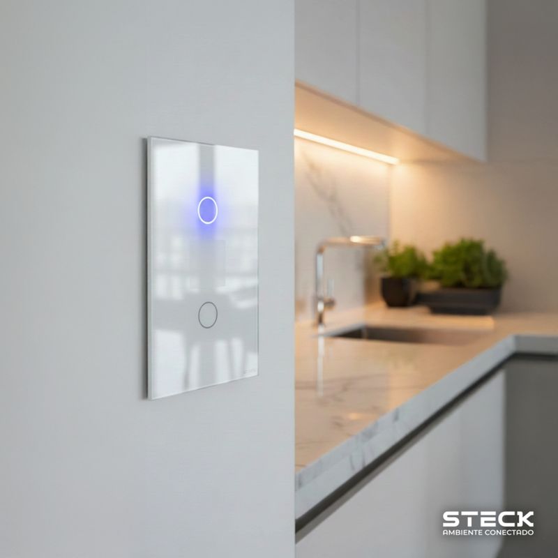 Elevando o controle da sua iluminação, o Interruptor Inteligente da linha Ambiente Conectado STECK combina modernidade e funcionalidade. Com um elegante painel touchscreen, ele permite o ajuste da iluminação com um toque leve, e pode ser monitorado e controlado pelo seu celular ou por comando de voz com a Alexa. Compatível com diversos tipos de lâmpadas, oferece flexibilidade e conveniência para personalizar seu ambiente. Experimente o futuro da automação residencial e aproveite os benefícios de uma casa inteligente com a tecnologia inovadora da STECK.