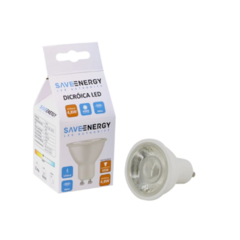 Lâmpada Dicróica LED 4,8W SaveEnergy é ideal para iluminação de destaque e ambientes que exigem foco direcionado. Possui temperatura de cor 4000K (branco neutro), proporcionando iluminação equilibrada e confortável. Seu ângulo de abertura de 24° garante luz concentrada, valorizando objetos e áreas específicas. Com 380 lúmens, oferece boa eficiência luminosa com baixo consumo de energia. Produto bivolt, indicado para uso residencial e comercial.