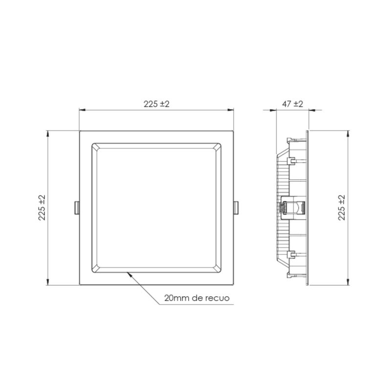 Painel de LED De Embutir Quadrada Recuada Branco de 22,5x22,5cm, potência 20W, ângulo 120°, fluxo luminoso 1220lm, índice de proteção IP20. Medida do nicho - 20,5x20,5x4,3 cm.