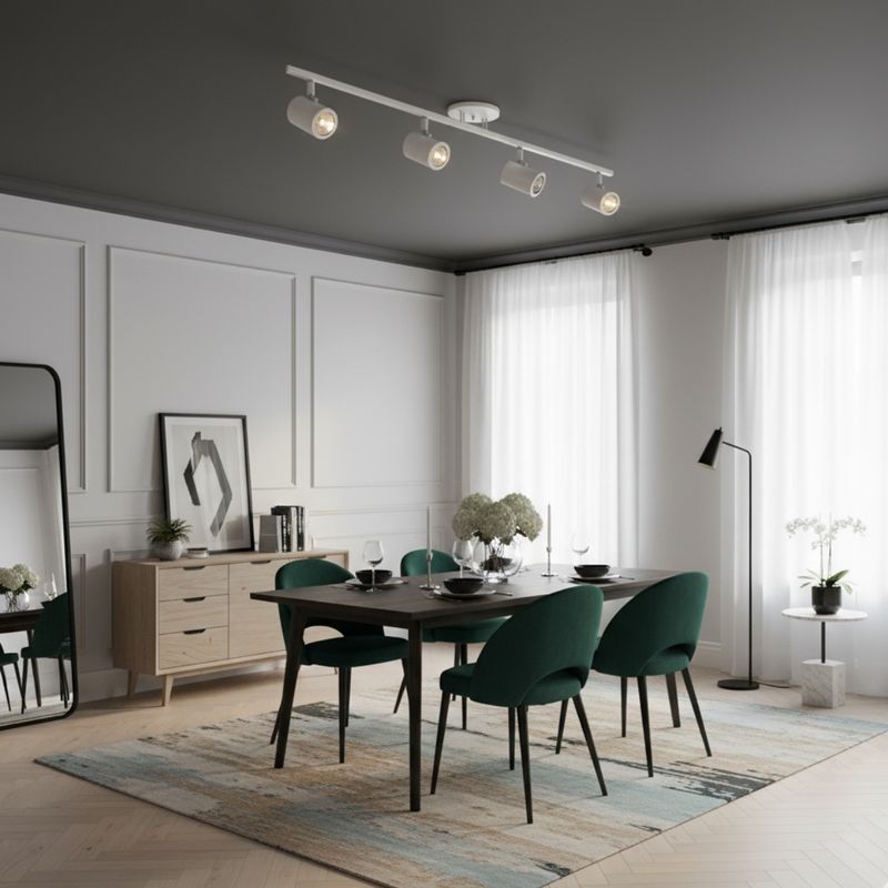 Focos Direcionáveis: Os 4 spots podem ser ajustados individualmente, permitindo que você personalize a direção da luz e crie diferentes focos no ambiente (destaque em quadros, objetos, bancadas).